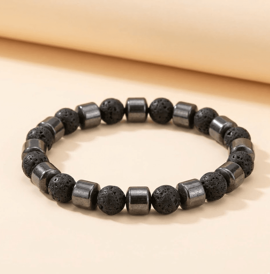 Stilinga apyrankė, pagaminta iš natūralių akmenų – lavos ir hematito. Gilus matinės juodos ir metalinio blizgesio derinys atrodo įspūdingai, tačiau išlieka universalus – ši puošmena tinka tiek moterims, tiek vyrams. Elastingas pagrindas leidžia patogiai užsidėti apyrankę be užsegimo, o dydis gali būti pagamintas individualiai pagal riešą.