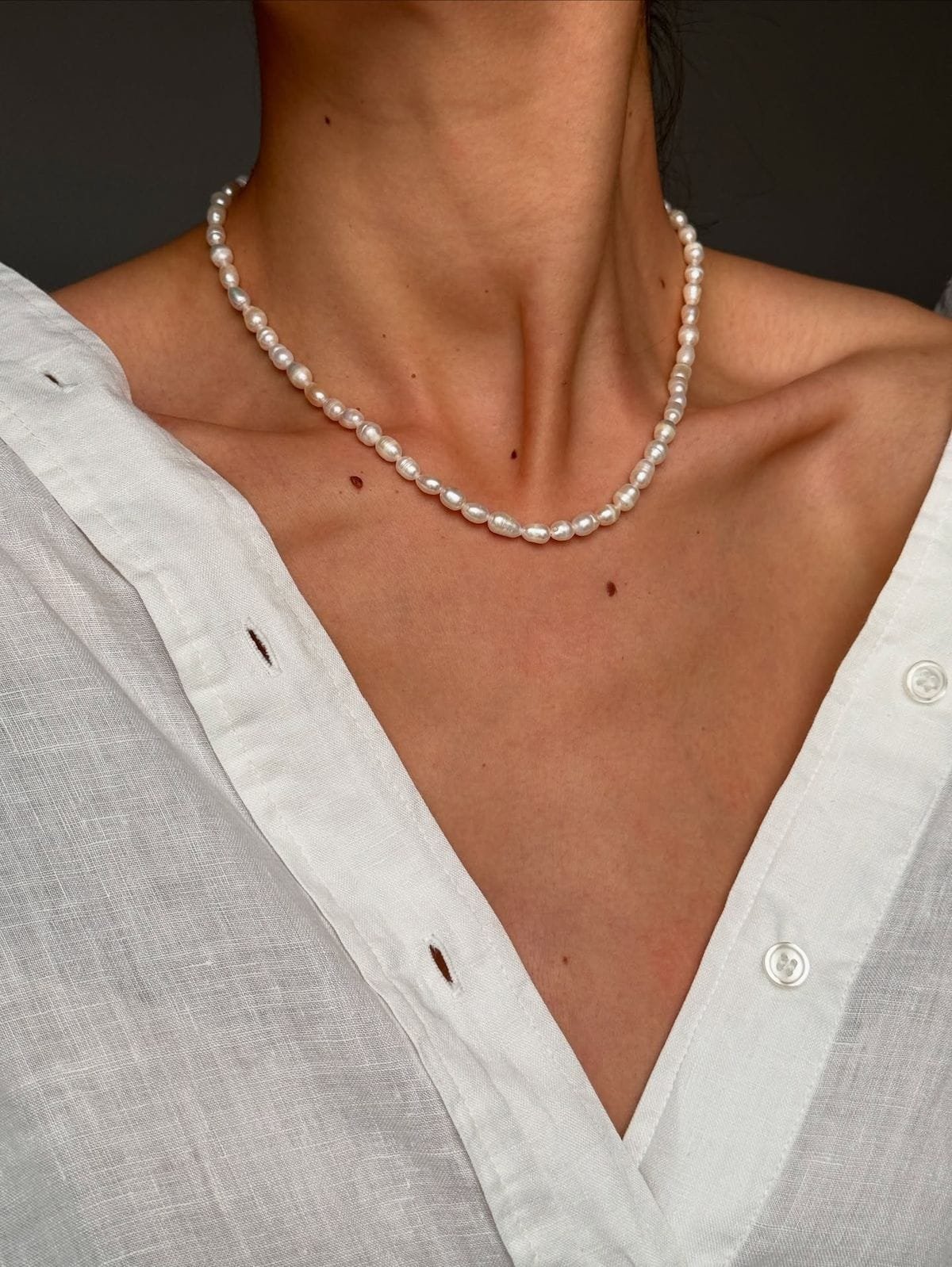 Vėrinys suvertas iš aukštos kokybės gėlavandenių perlų su švelniu blizgesiu, kurie idealiai gula ant kaklo linijos. Ypatingo dėmesio verta furnitūra – patikimas užsegimas pagamintas iš medicininio aukso. Tai garantuoja, kad gaminys ilgus metus išlaikys nepriekaištingą išvaizdą, nepatamsės ir nesukels alerginių reakcijų.